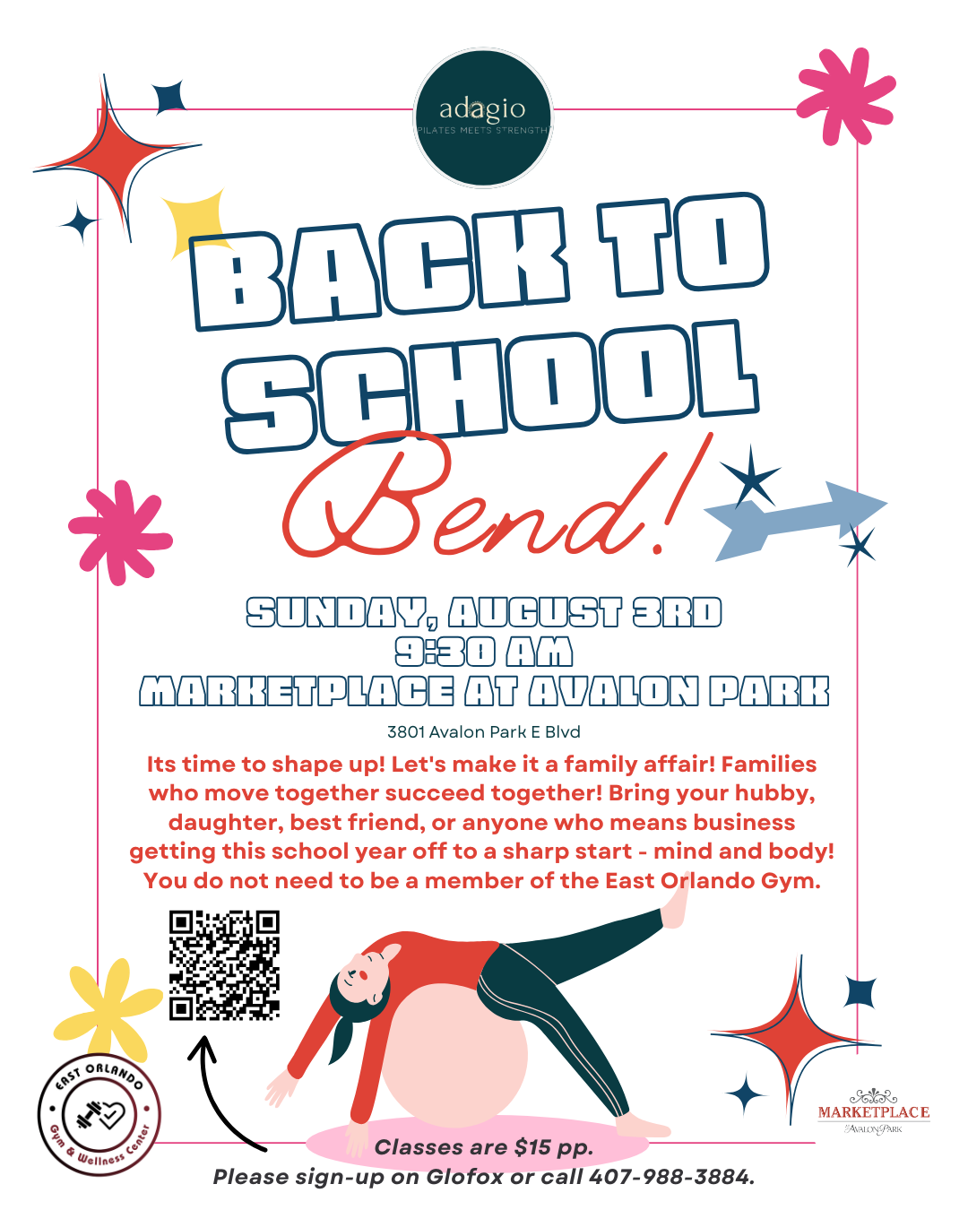 Join us at Marketplace at Avalon Park on Sunday, August 3rd at 9:30 AM for a Back to School Bend pop-up workout with Adagio!