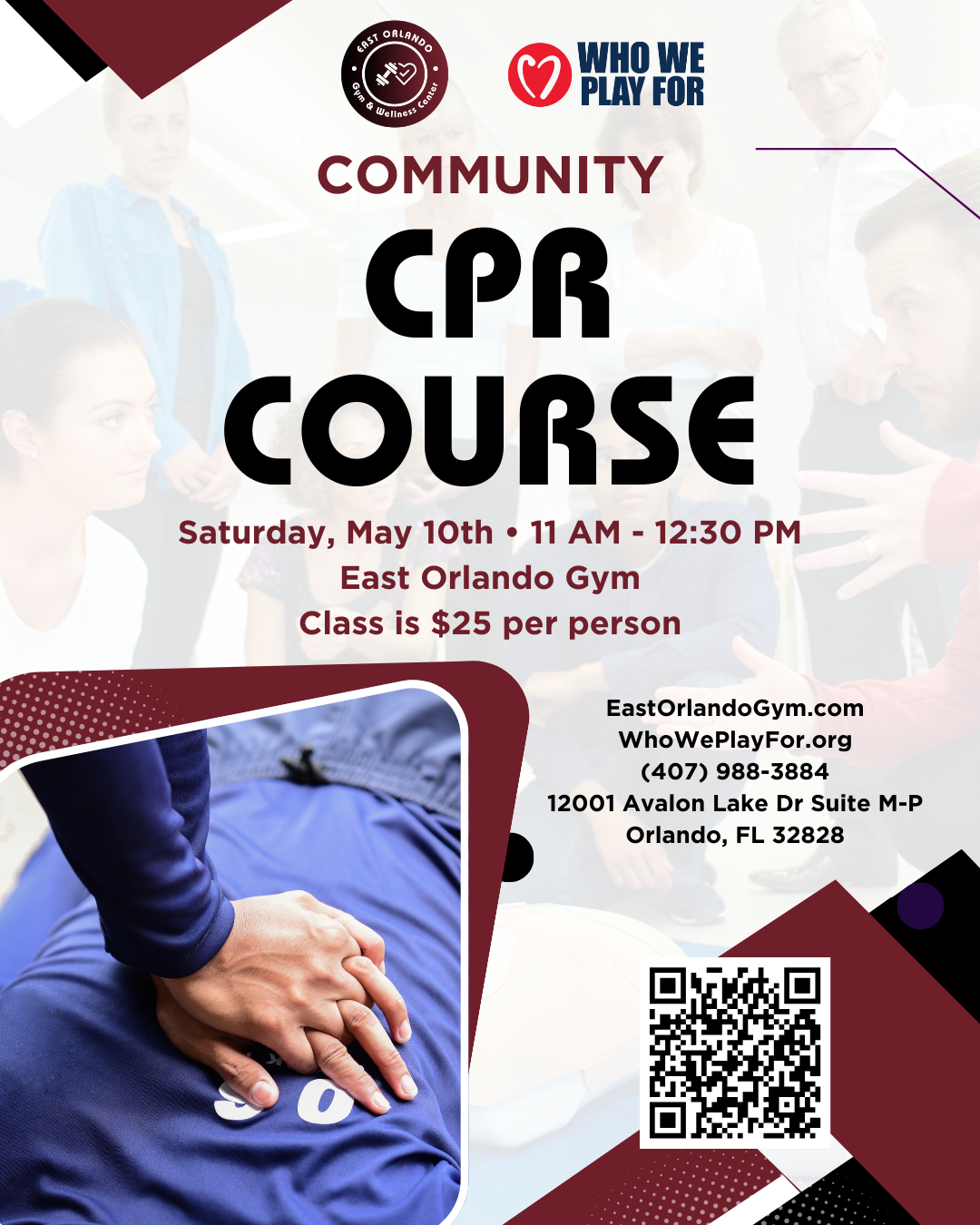 Join our Community CPR Course on Saturday, May 10th from 11 AM to 12:30 PM at East Orlando Gym.