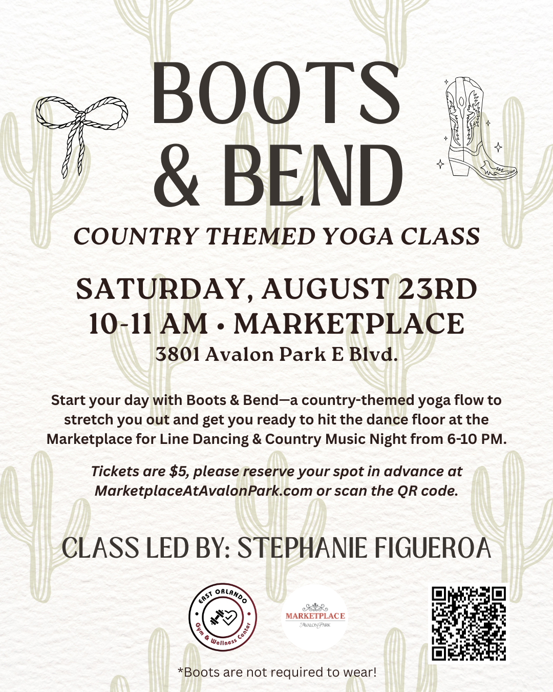 Sunday August 23rd at 10 AM at The Marketplace—flow to country tunes in your boots and bandana! Roll out your mat and join our community stretch.