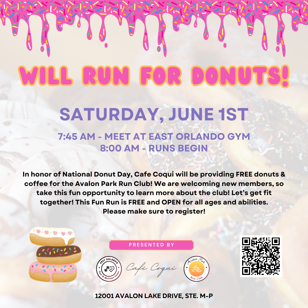 In honor of National Donut Day, Cafe Coqui will be providing FREE donuts & coffee for the Avalon Park Run Club! We are welcoming new members, so take this fun opportunity to learn more about the club! Let’s get fit together! This Fun Run is FREE and OPEN for all ages and abilities.