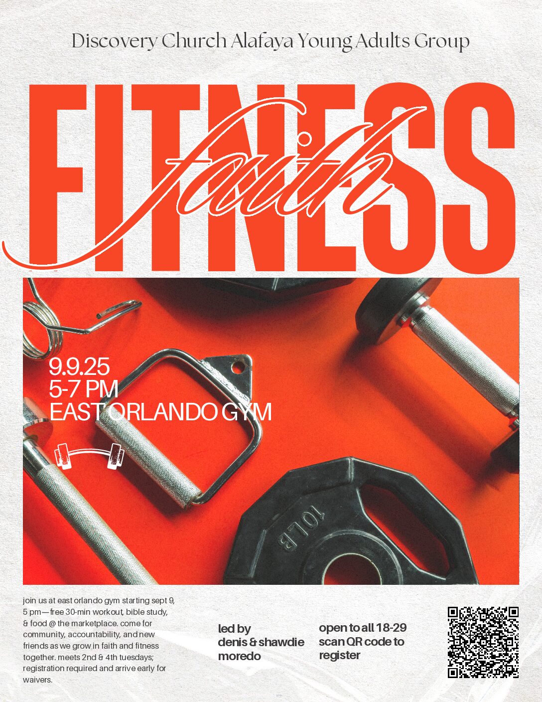 Discovery Church will be joining us at East Orlando Gym every other Tuesday starting 9/09 at 5pm for a free 30-minute fitness class followed by a time of reflection and community. Afterward, we’ll head to The Marketplace to enjoy refreshing food and fun together.