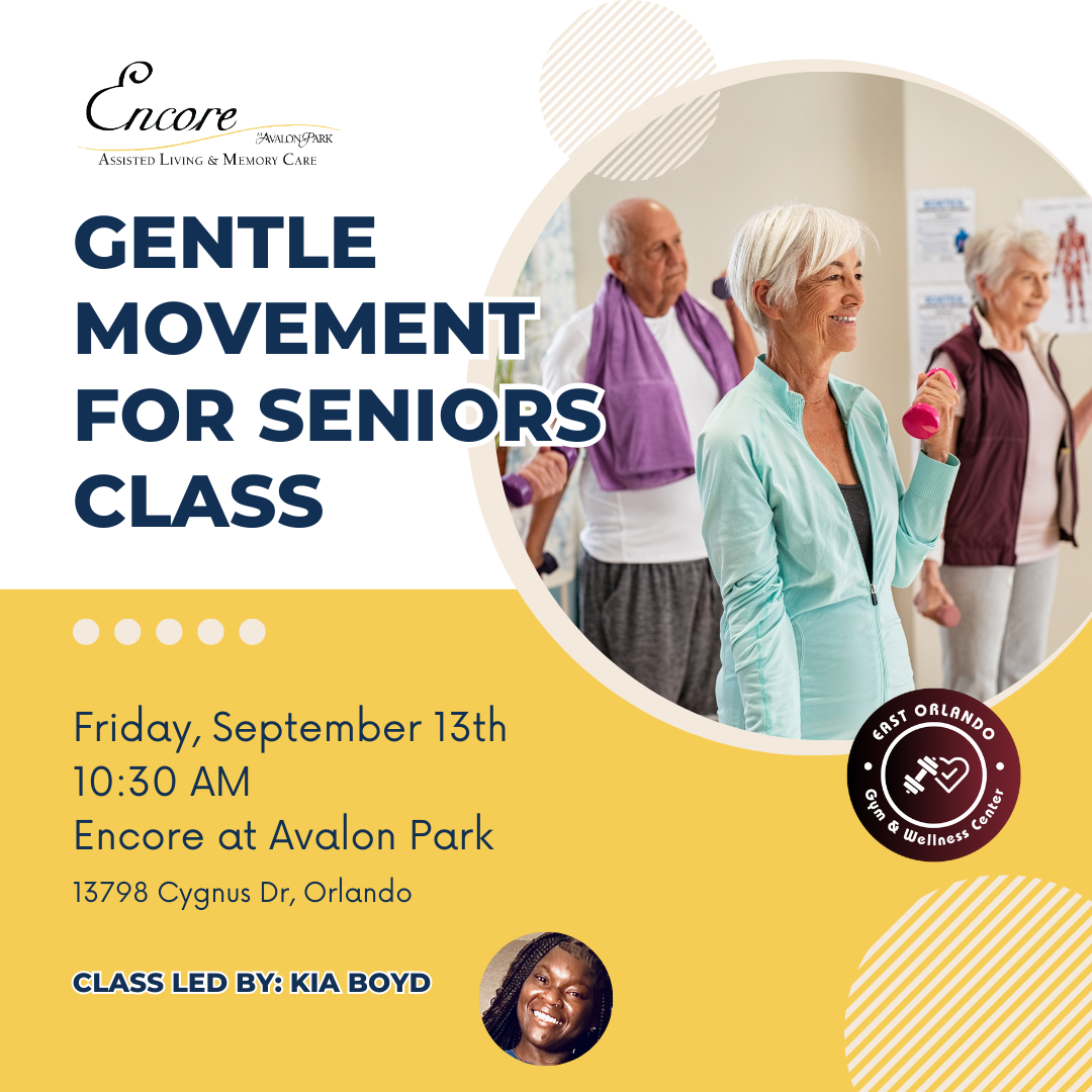 Seniors are invited to ooin us for a low-impact exercise class led by East Orlando Gym instructor, Kia Boyd at Encore at Avalon Park!