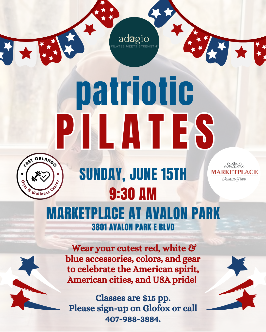 Celebrate the American spirit with movement, strength, and community at our Patriotic Pilates class, hosted by Adagio – Pilates Meets Strength in partnership with the East Orlando Gym & Wellness Center and The Marketplace at Avalon Park.