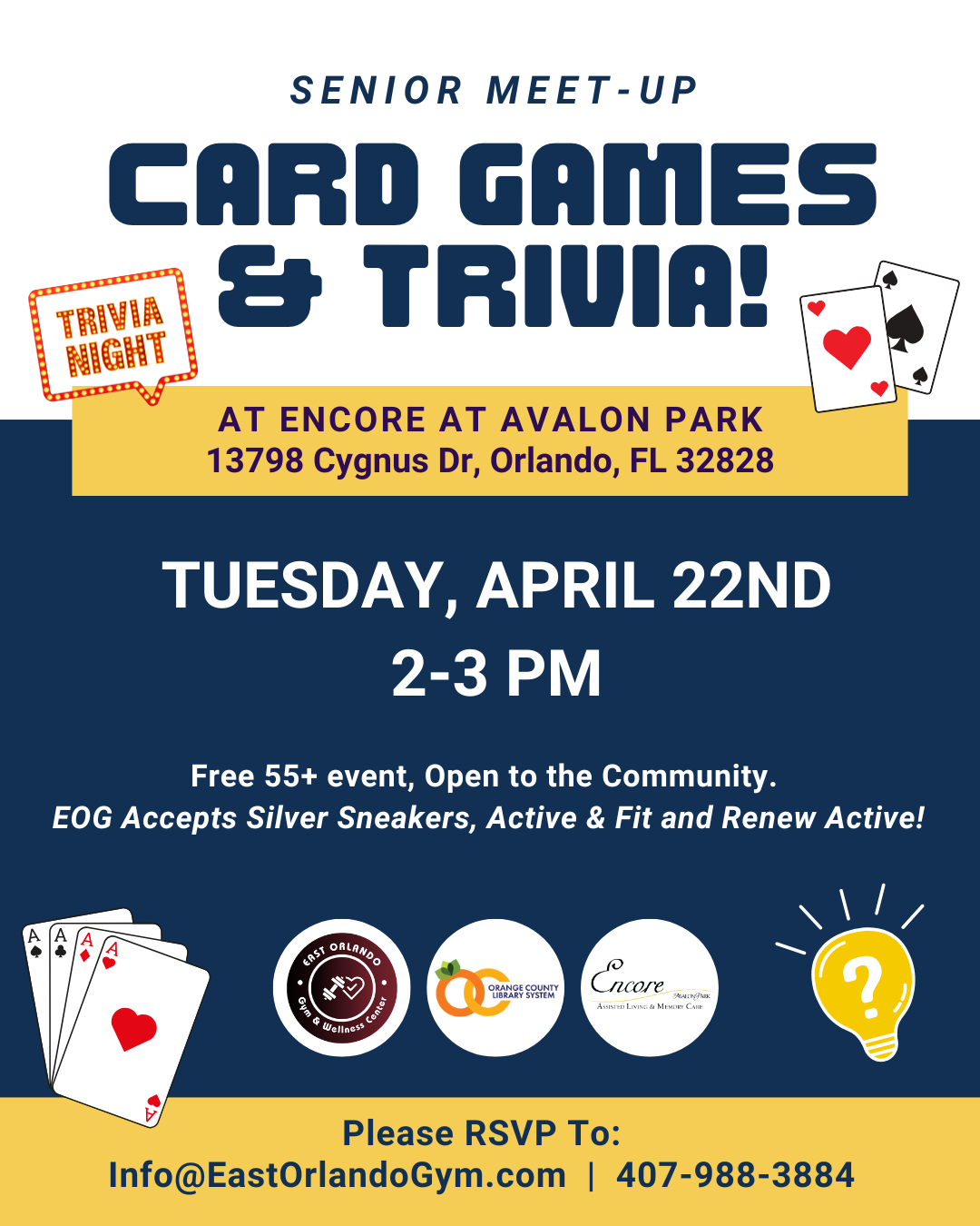 We’re thrilled to partner with Encore at Avalon Park for an afternoon of Card Games & Trivia—the perfect chance to socialize, have fun, and keep your mind sharp.