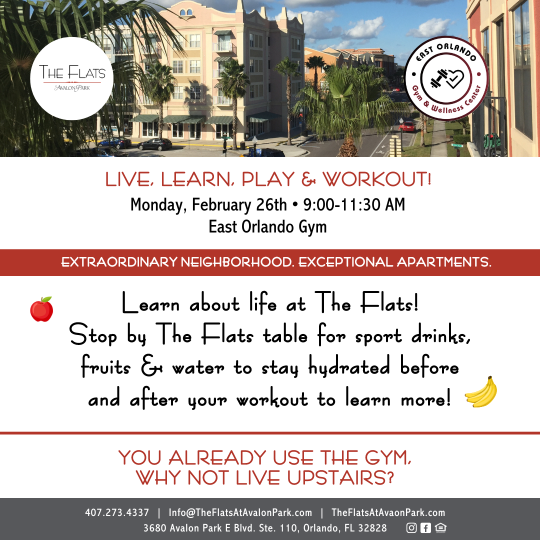 Stop by The Flats table for sport drinks, fruits & water to stay hydrated before and after your workout to learn more!