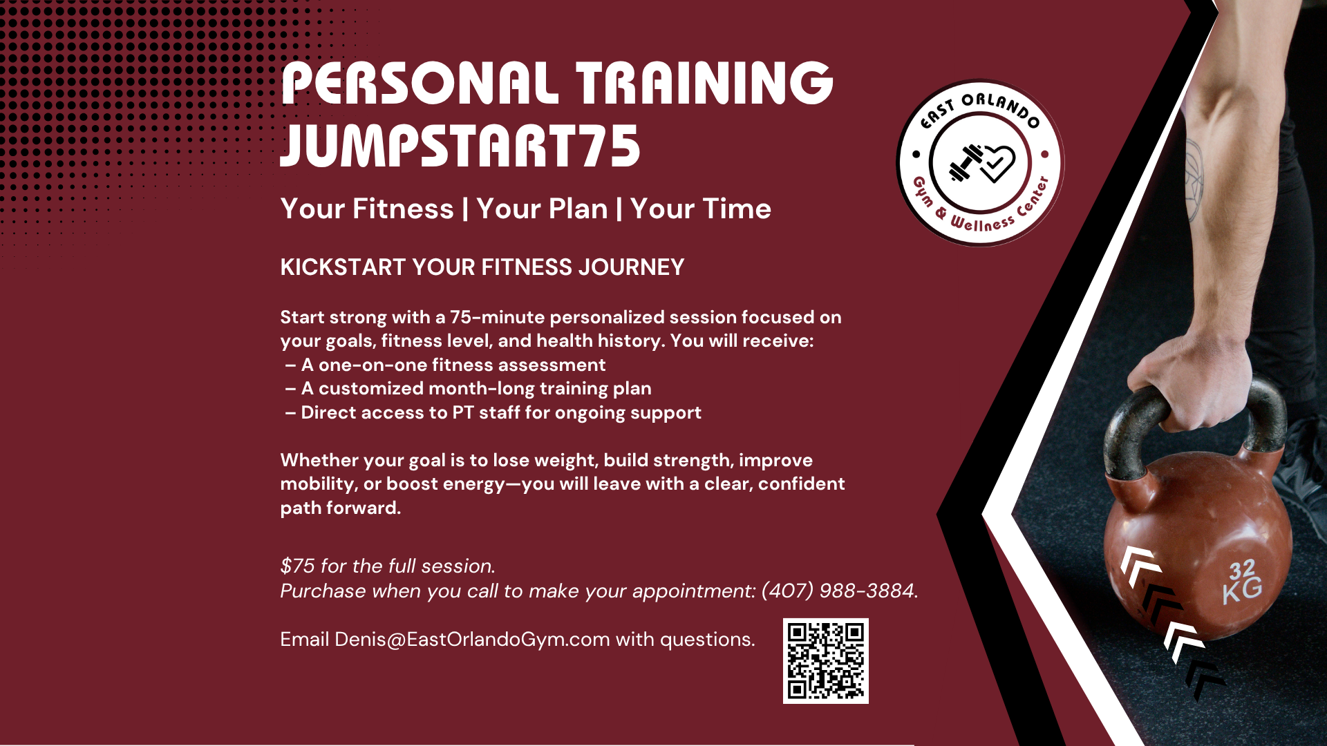 If you are new to the gym, restarting after a break, or looking for clarity in your workouts, Jumpstart 75 is your launchpad. Reach out today to schedule your assessment and get your fitness journey started the strong way at East Orlando Gym.