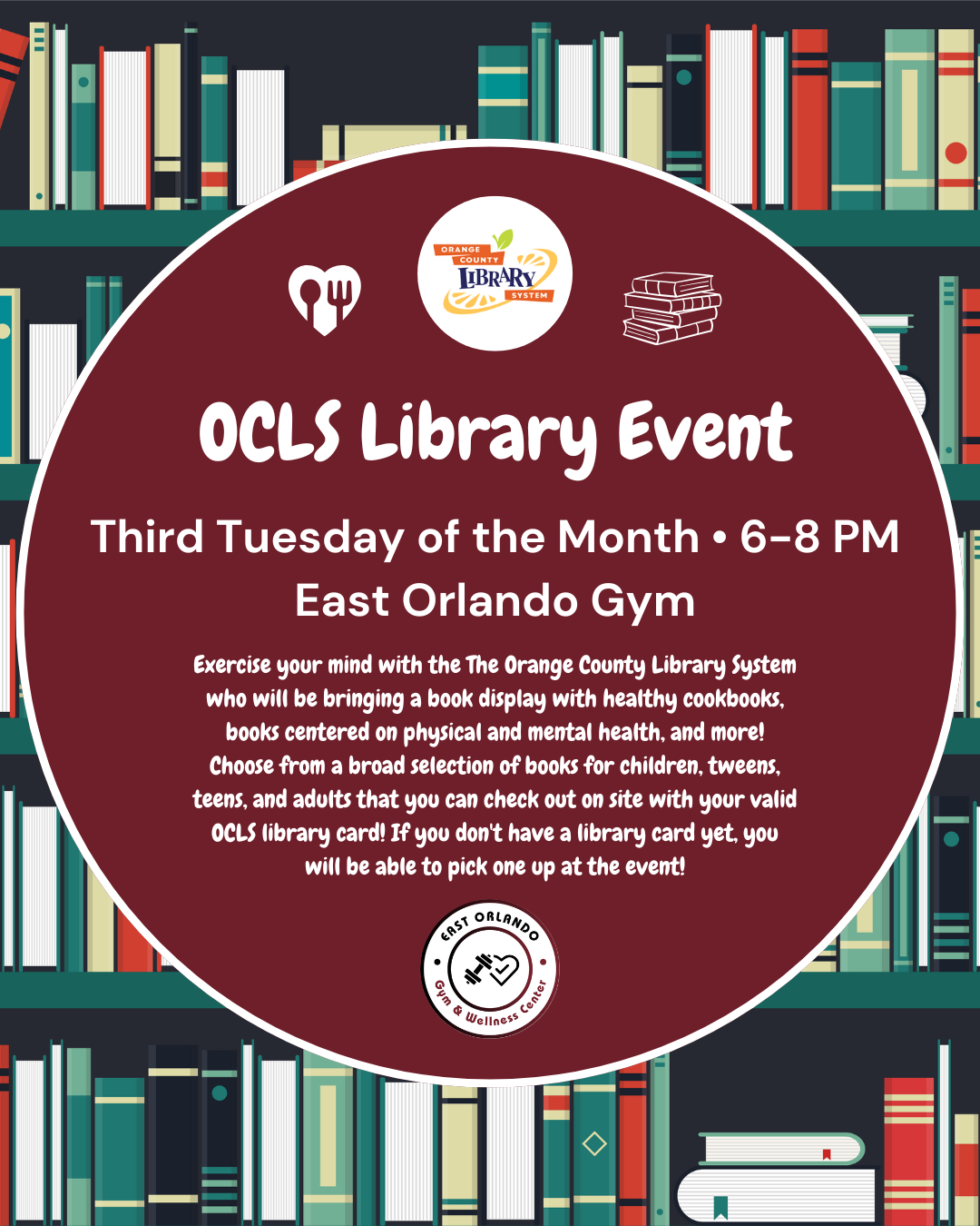 Exercise your mind with the The Orange County Library System who will be bringing a book display with healthy cookbooks, books centered on physical and mental health, and more! Choose from a broad selection of books for children, tweens, teens, and adults that you can check out on site with your valid OCLS library card! If you don't have a library card yet, you will be able to pick one up at the event!